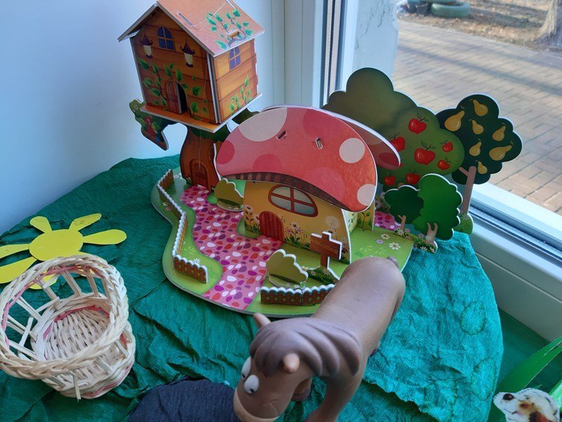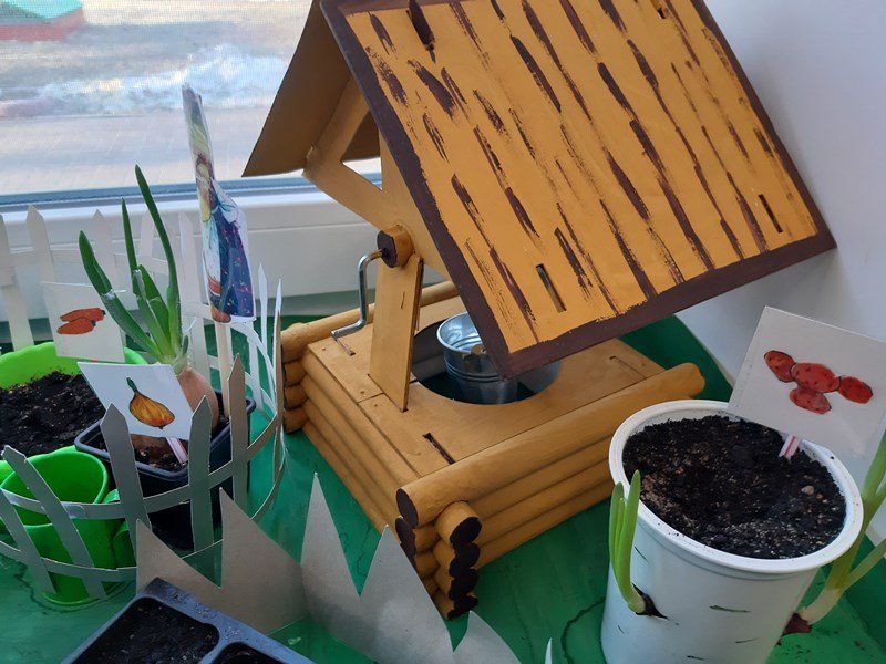 Дети всех дошкольных групп вместе с воспитателями сеяли семена, своевременно поливали и ухаживали за ними. Каждая группа оригинально оформила свой мини - огород: колодец, дед с бабкой пололи грядки с зеленью, зайчик прячется в зеленом луке, и ослик с удовольствием пожевывали сочную зелень.