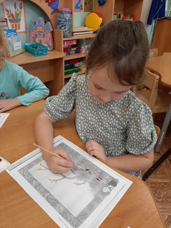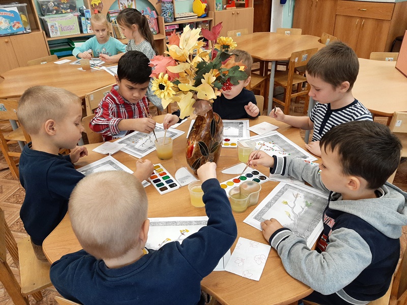 В разновозрастной группе «Ромашки» прошла образовательная деятельность по художественно - эстетическому развитию. «Пейзаж. Краски осени» Воспитатель Сафоничева Татьяна Григорьевна учила детей передавать колорит золотой осени, правильно располагать рисунок по всему листу бумаги, вызывала интерес к изображению времени года «Осень».