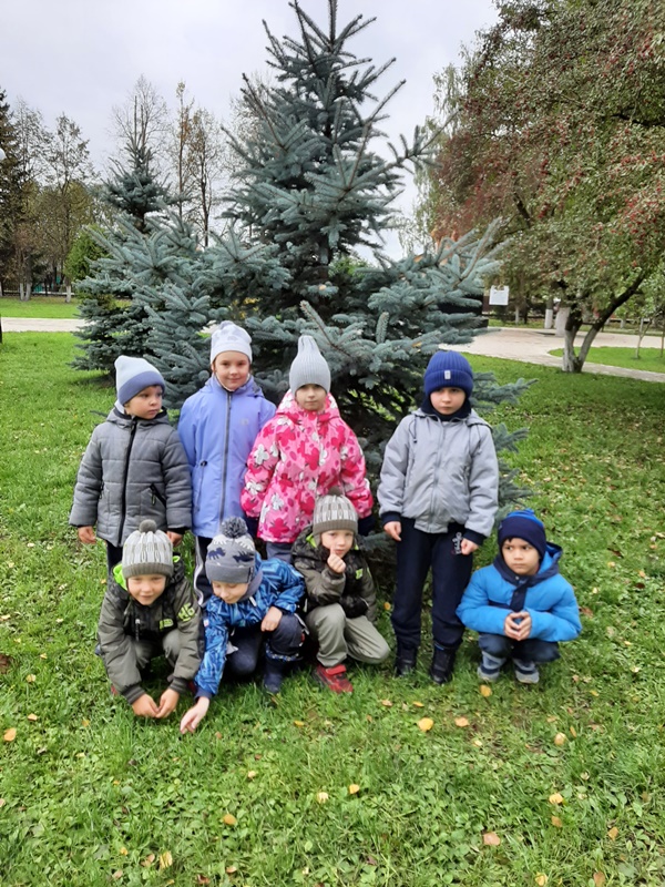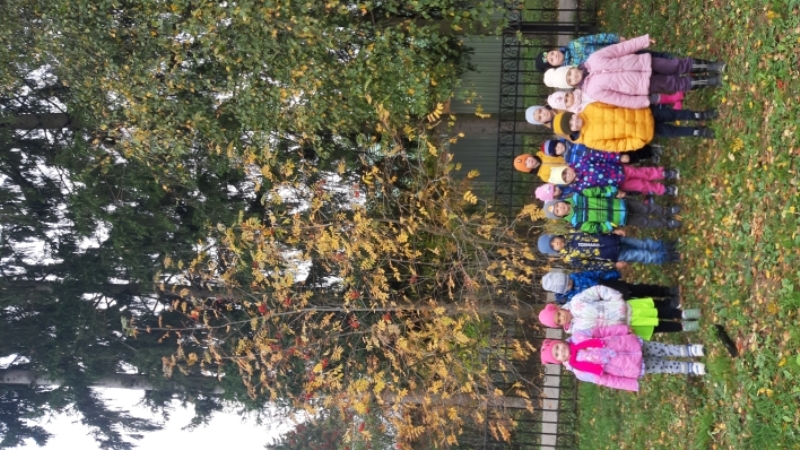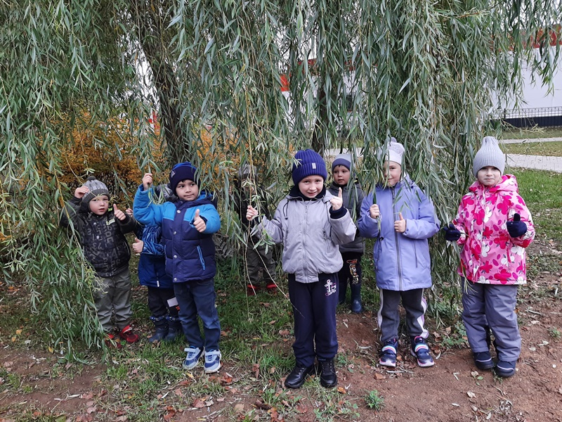 После ООД на прогулке была организована экскурсия в осенний парк, где ребята повторили названия деревьев. Вспомнили, что первой сбрасывают листу липа. Клен сменил зеленую окраску листьев на желтую и красную, поиграли в игру «Добежим до дерева….», обнялись с плакучей ивой.