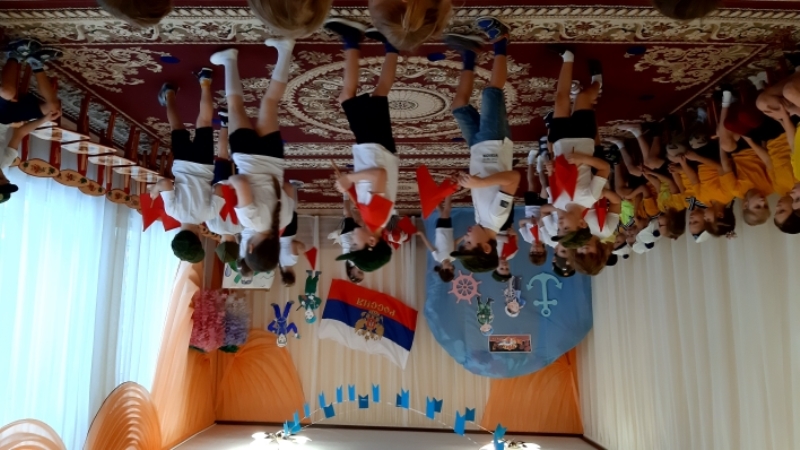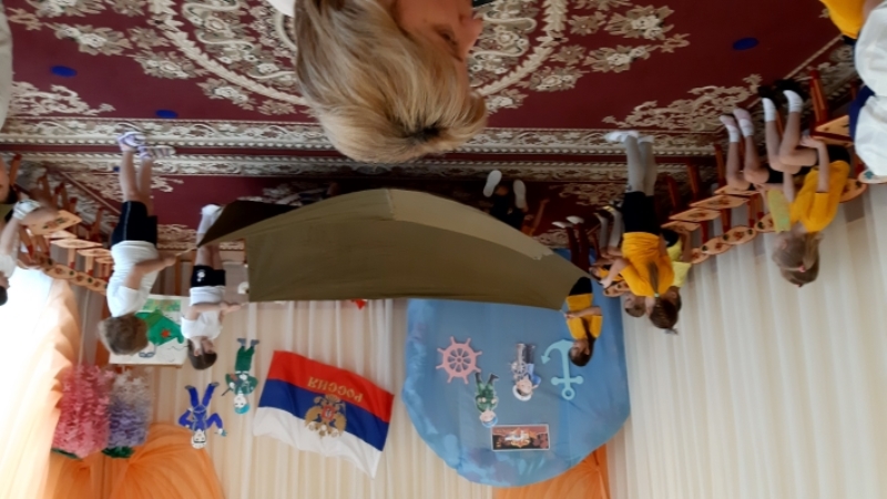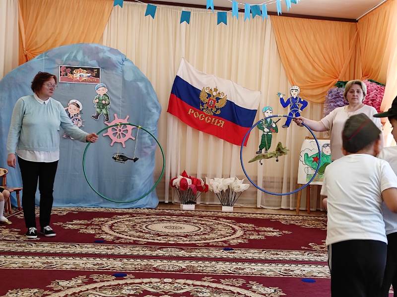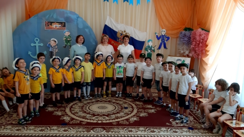 Праздник состоялся в форме игры "Школа молодого бойца". Он состоял из различных эстафет и конкурсов между мальчиками группы "Ромашка" и "Пчелки".